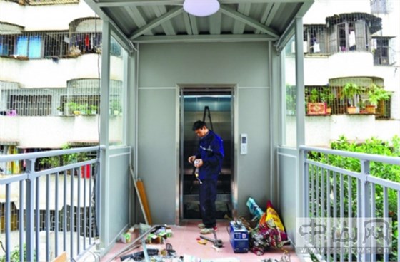 東區(qū)夏洋街63號舊樓電梯已經(jīng)安裝完畢,工人忙著進(jìn)行相關(guān)檢測工作。記者 文波 攝